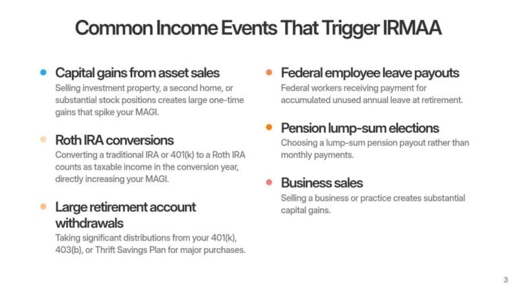 - Business sales: Selling a business or practice creates substantial capital gains, often the largest single income event for many retirees, with huge IRMAA implications.