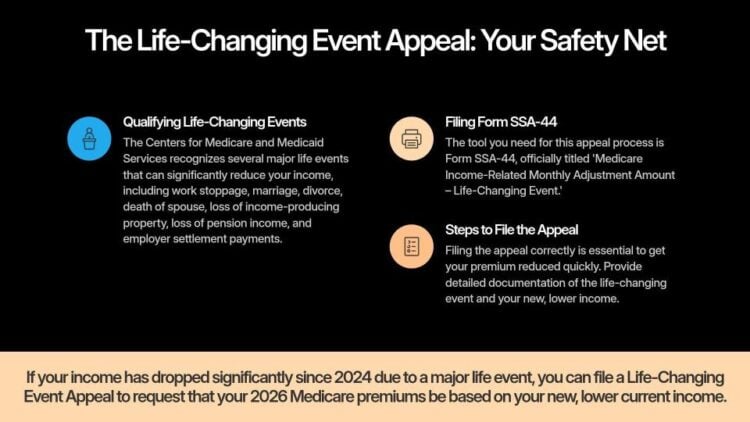 If your income has dropped significantly since 2024 due to a major life event, you can file a Life-Changing Event Appeal using Form SSA-44 with the Social Security Administration (SSA) to request that your 2026 Medicare premiums be based on your new, lower current income.