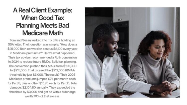 Tom and Susan walked into my office holding an SSA letter. Their question was simple: “How does a $25,000 Roth conversion cost us $2,100 every year in Medicare premiums?”