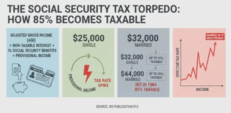 The “Tax Torpedo” refers to the income range where earning an extra $1 of income triggers tax on $0.85 of Social Security benefits. This creates an effective marginal tax rate that is much higher than your statutory tax bracketโoften pushing a 12% or 22% bracket filer into a 40%+ effective rate zone.