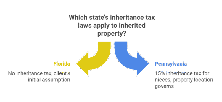 I had a client in 2024 who lived in Florida but inherited property from her aunt in Pennsylvania. She assumed Florida’s no-tax rules applied. Her estate attorney and I had to explain that for real estate, the law of the state where the property is located governs.